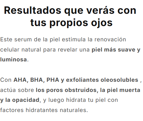 Muchas personas notan su piel más limpia y suave desde la primera aplicación. Con un uso constante, puede esperar una mejora general en la textura y luminosidad de la piel en unas pocas semanas.
