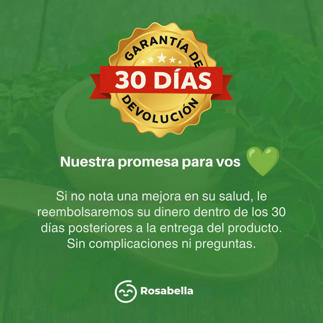 Queremos que experimentes los beneficios de Rosabella Moringa™️ con total confianza. Si en 30 días no notás más energía, mejor descanso o reducción del estrés, te devolvemos el 100% de tu dinero. Sin complicaciones, sin preguntas. Es simple: si no te funciona, no pagás.